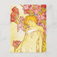 Carte postale Alphonse Mucha Iris. Peinture à l'huile sur toile. Le peintre tchèque Alphonse Mucha a peint une série allégorique dépeignant diverses fleurs comme de belles femmes. Iris est dotée d'une jolie brune vêtue d'une robe mince. La femme est entourée d'iris violets géants qui grimpent l'arrière - plan jaune et bleu. Un grand cadeau pour les amateurs de Mucha, de peintures à l'art nouveau et allégoriques.