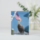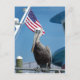 Tandis que le drapeau américain souffle dans la brise ce beau pélican se balance sur un navire en train de rouler. Photo prise à la marina près de Clearwater Beach, Floride.