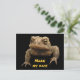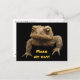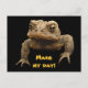 Un crapaud américain (Bufo americanus) qui a l'air grincheux vous regarde depuis l'avant de cette carte postale. Ce petit amphibien est brun, noir, doré, vert olive et orange. Ses verrues le distinguent de ses voisins de grenouille. Bien qu'éclos dans l'eau des étangs, des rivières, des lacs ou des cours d'eau, les têtards se déplacent rapidement vers l'endroit où les crapauds vivent leur vie adulte. Son appel surprenant est un long cri. Il a l'air assez féroce, mais c'est en fait un petit gars doux qui mange beaucoup de parasites du jardin, y compris les insectes et les limaces. Le texte dit : "Faites ma journée !" Il peut être customisé ou supprimé.