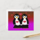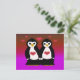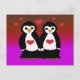 Un mignon couple de pingouins tenant des palmes chacun avec un coeur rouge sur le ventre. Un arrière - plan ombragé de violet et de rouge avec des coeurs flottants rouges.