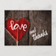 Cette carte postale de remerciement comporte une sucette en forme de coeur rouge avec le mot amour. Il est situé sur un terrain rustique en bois de grange.