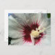 Agrandir l'image détaillée d'une fleur rose et blanche de Sharon (semblable à un hibiscus) avec des gouttelettes d'eau qui brillent sur ses pétales au soleil après une tempête de pluie.