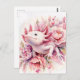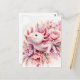 Cette carte postale présente une adorable salamandre axolotl rose pâle parmi les fleurs dans un portrait animal floral féminin. L'axolotl a une expression douce et fantaisiste, avec ses branchies extérieures distinctives peintes dans un rose vif qui s'harmonise avec la palette globale. Elle est entourée de fleurs luxuriantes aux tons roses et pêche, avec des feuilles délicats et des éléments botaniques qui ajoutent à la composition. La palette de couleurs douce et rêveuse, associée à la représentation détaillée de l'axolotl et des fleurs, crée une image charmante et sereine.