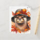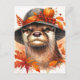 Cette carte postale présente une loutre grincheuse portant un casquette orné d'éléments de saison d'automne. Un tableau amusant pour les amateurs de loutre, les amateurs d'automne et les amateurs d'illustrations d'animaux moches. Les couleurs chaudes sont rouge, orange et marron, et les éléments d'automne comprennent des feuilles d'automne, un petit citrouille et des baies rouges pour une faune botanique saisonnière.