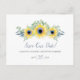 Annoncez vos fiançailles avec ma carte "save the date" aquarelle botanique de tournesol, de verdure d'eucalyptus et de bleu avec la mention "save our date" en calligraphie chic. La carte florale se retourne sur une couleur bleue complémentaire unie avec vos noms et date de mariage avec un espace prévu pour l'adressage des invités. Annonce de mariage parfaite pour les mariages de fin d'été et de jardin d'automne. Pour voir la suite de papeterie de mariage assortie, visitez VG Invites sur Zazzle