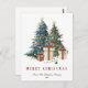 Cette élégante carte postale de sapin de Noël arbore deux arbres de Noël ornés de verres et entourés de cadeaux emballés. Personnalisez la carte postale en ajoutant vos voeux de Noël, votre nom de famille et l'année.