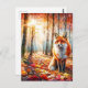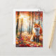 La carte postale présente une aquarelle d'un renard alerte dans une forêt pendant la saison d'automne, entourée de feuilles d'automne. Portrait aux couleurs chaudes, oranges, rouges, jaunes et marron, le soleil brille à travers les arbres. Parfait pour la saison d'automne !