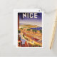 Cette carte postale est une réplique d'une affiche de voyage Art Déco vintage pour Nice, France et est une oeuvre d'art étonnante. L'affiche présente une élégante dame se reposant sur un balcon, avec vue sur la ville en contrebas. La ville est dépeinte dans un style Art déco animé, avec des gens à la mode en train de se promener à côté de voitures classiques sur la route bordée de palmiers. La route tourne autour de la côte jusqu'à des collines à l'horizon, et il y a des gens sur la plage de sable et des bateaux à voile en mer. Le premier plan est rempli de fleurs, ajoutant une touche de beauté et d'élégance à la scène. C'est un excellent moyen de se souvenir de votre voyage à Nice, en France ou de vous inspirer pour planifier un futur voyage.