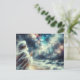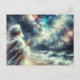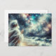L'image montre une figure debout avec un bras tendu contre un arrière - plan cosmique vibrant et coloré qui ressemble à une nébuleuse étoilée. Le personnage semble porter une robe flottante, donnant une impression de grandeur ou d'autre monde. La scène cosmique est remplie de teintes de bleu, d'orange et de blanc, suggérant l'immensité et la beauté de l'espace.
