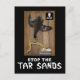 Monture de canard avec un canard colvert mort et huilé, du matériel de déplacement terrestre, un crâne et des os croisés. Le texte "STOP THE TAR SANDS" apparaît également. Malheur à toute sauvagine qui atterrit dans un bassin de résidus toxiques en Alberta où un pétrole extrêmement visqueux est extrait des sables bitumineux (c'est-à-dire des sables bitumineux) avec d'horribles effets de l'environnement. Les sables bitumineux de l'Alberta sont constitués de pétrole brut lourd mélangé avec du sable, de l'argile et du bitume. L'extraction implique la combustion du gaz naturel pour générer suffisamment de chaleur et de vapeur pour faire fondre l'huile du sable. Pas moins de cinq barils d'eau sont nécessaires pour produire un seul baril de pétrole. Chaque jour, des millions de litres d'eau sont contaminés par des produits chimiques, dont l'arsenic, le cuivre, le plomb et le zinc, pour séparer fondamentalement l'huile de sables bitumineux (appelée bitume dilué) du sable. Mais l'eau est tellement contaminée après ce processus qu'ils doivent la stocker dans des boues toxiques appelées bassins de résidus. On estime que 3 millions de gallons d'eau contaminée fuient chaque jour des bassins de décantation dans la rivière Athabasca en Alberta et dans le paysage environnant. Dites non aux sables bitumineux.