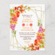 Cette carte postale mariage ludique et fantaisiste présente une grenade aquarelle, des pommes, du raisin, des champignons et du feuillage sur un cadre géométrique doré. Le texte combine écriture manuscrite et polices serif pour un look élégant et moderne. C'est parfait pour un mariage de automne d'automne rustique.