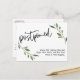 L'avant comporte un en-tête graphique que j'ai conçu en utilisant une police d'écriture moderne et décontractée, qui dit "Postponed". En bas, il y a un message joyeux que vous pouvez éditer, qui déclare votre nouvelle : "Nous nous marions toujours ! En ce moment, nous ne sommes tout simplement pas sûrs de quand cela arrivera." Accentué de deux ressorts de verdure aquarelle, tous les calques ont été ajoutés séparément et laissés déverrouillés pour vous donner un contrôle maximum de la conception. Utilisez les champs modèles pour ajouter vos données personnelles et modifier n'importe quel de mes projets de texte pour répondre à vos besoins et à votre situation.