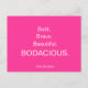 La carte postale "Bald & Bodacious" Hot Pink Breast Cancer par Illustrator & Cartoonist April McCallum. Légende : "Bald. Courageux. Beau. Bodacieux." et "Tu vas la fille !" Caricatures et expressions provocatrices et sassy. "Raising Eyebrows & Making Impressions" pour la sensibilisation au cancer du sein.