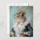 A regal frog, positioned centrally within a vertical portrait frame, is the main subject. The frog has smooth, mottled green skin with large, prominent golden eyes that gaze directly forward. It is adorned with an elaborate gold crown, intricately detailed, and wears a lavish white ruffled collar. The frog is dressed in a rich, dark teal and gold patterned coat, indicative of royal Baroque fashion. A delicate butterfly rests on its crown. The background is a soft, muted teal, providing a gentle contrast. The composition is reminiscent of a classical portrait, with warm, soft lighting that highlights the textures and details, creating an elegant and whimsical atmosphere.