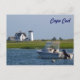 Image pittoresque de Cape Cod, cette photo présente un bateau à moteur amarré et un phare au soleil du soir à Stage Harbour, Chatham, Massachusetts