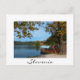 Carte postale de bateaux touristiques traditionnels colorés dans le lac Bled sous un châtaignier aux couleurs de l'automne dans un paysage d'automne en Slovénie avec une frontière blanche et le texte : 'Slovénie'.