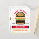 Annoncez votre fête d'anniversaire BBQ à votre famille et à vos amis avec cette carte postale faire-part personnalisée adaptée à tous les âges, avec une illustration moderne d'un hamburger avec flammes en rouge, orange, jaune, marron et noir sur un arrière - plan blanc avec typographie colorée en caractères gras. Personnalisez-le avec tous les détails dont vous avez besoin pour invitation vos invités, y compris le nom, l'âge, le jour, la date et l'occasion sur la couverture et des informations supplémentaires avec les adresses et les détails RSVP au dos. Conçu par © Tim Coffey.