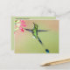 Carte postale montrant le magnifique colibri en raquettes vert métallique de l'Equateur volant vers une fleur avec ses ailes larges ouvertes et ses longues plumes de queue déployées gracieusement derrière lui. En plus de ses magnifiques plumes de queue en forme de raquette, ce petit colibri andin spectaculaire a des bottes de pattes blanches bouffantes. Grande carte pour colibri, nature et amoureux de les jardins ! Photo prise à Tandayapa, Equateur.