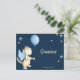 Précieuse carte de remerciement pour baby shower en espagnol pour remercier vos invités de leurs cadeaux. La carte postale a un magnifique fond bleu marine où l'illustration d'un bébé dragon avec des ailes bleues tient un ballon en forme d'hélium bleu clair. Pour compléter l'illustration, il y a des étoiles bleues et des cercles jaunes éparpillés ici et là.