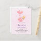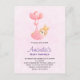 Baby shower invitation avec une adorable illustration d'un petit lapin brun portant une petite couronne dorée. Porté par des ballons dans une couverture de coeur rose.