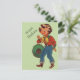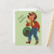 Dessin des années cinquante rétro d'une mignonne cowgirl en bottes, jeans bleus, chemise rouge et bandana jaune. Elle porte un casquette vert et a des cheveux bruns courts.