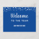 Bienvenue dans l'équipe avec du texte personnalisable. Confetti cercles et étoiles au sommet. Modifiez l'arrière - plan bleu en une autre couleur si vous le souhaitez. Bienvenue aux nouveaux membres ou employés avec une carte postale amusante.