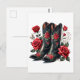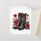 This postcard features a pair of black cowboy boots adorned with vibrant red roses, green leaves, and elegant tooled detailing. Perfect for country girls, Western fashion lovers, or anyone with a rustic romantic aesthetic, this floral cowgirl illustration blends Southern charm with feminine flair. Ideal for rodeo invitations, bridal showers, thank-you notes, or country-themed events. Add your own text to make it perfect for personal messages or stationery! A bold and beautiful addition to any Western-themed collection.