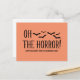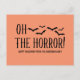 Carte postale Oh The Horror Halloween, tendance et moderne, avec un design typographique cool et un tas de chauves-souris éffrayantes en noir. Cette carte postale simple et amusante de design de texte peut être facilement customisée avec un accueil Halloween amusant et la couleur arrière - plan de votre choix. Pour plus d'options de personnalisation, cliquez sur Customiser.