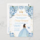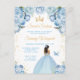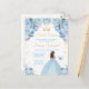 Cette invitation d'anniversaire élégante et glamour pour un sweet sixteen présente une belle princesse à la peau foncée dans une robe de bal bleu clair. Le texte combine une écriture manuscrite et des polices sans empattement modernes pour un look classe et sophistiqué. Les arrangements floraux, le papillon et les confettis dorés créent le mélange parfait de rustique et de chic.