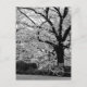 Une photo en noir et blanc d'un vélo garé devant un grand cerisier en fleurs dans une rue de Tokyo, au Japon.