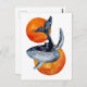 aquarelle traditionnelle peindre une grande baleine bleue plongeant devant deux boules d'or surréalistes sur une carte postale.