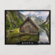 Photo carte postale d'un cabine en bois à l'intérieur du lac Obersee entouré par de belles hautes Alpes dans un paysage de Bavière à la pointe sud-est de l'Allemagne, près de la frontière avec l'Autriche avec un bord noir et dans une boîte noire le texte 'Bavière'.