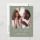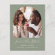 Cette carte postale simple et minimaliste Save the Date présente une photo en arc au-dessus des mots "Save the Date" dans un élégant script d'écriture manuscrite blanche, suivie des noms du couple, de la date mariage et de la ville en caractères sans serif sur un arrière - plan vert sage. Ajoutez votre adresse de retour et des détails supplémentaires au verso, ainsi qu'un code QR pour aider les clients à visiter votre site Web mariage.