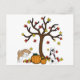 Cette carte postale a deux Huskies sibériens qui rebondissent et jouent dans les feuilles qui tombent d'un arbre avec des citrouilles.