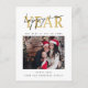 Carte postale moderne et élégante du Nouvel An. Le design comprend une photo de la famille, un joli script de la nouvelle année en lettrage moderne, votre message et un motif de pois doré festif au dos de la carte. Une façon parfaite de souhaiter à tous une Bonne Année !