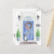 Annoncez votre nouvelle adresse avec notre faire-part élégante avec un Boston Terrier, porte d'entrée bleue, tapis de bienvenue, ardoise, topiaires et une couronne fleurie sur un arrière - plan en brique grise.