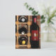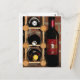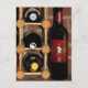 Cette carte postale colorée présente une simple durée de vie d'une bouteille de vin debout à côté de trois bouteilles supplémentaires dans un porte-vin en bois. Un arrière - plan rustique en brique complète la composition.