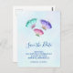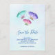 Enregistrez la carte postale de date avec un design de nature délicat. 3 papillons aquarelles, peints en rose, violet et vert. Arrière - plan d'aquarelle bleu foncé.