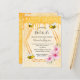 Elégante, amusante, invitation de la douche nuptiale d'été. Jaune, arrière - plan blanc avec un motif de nid d'abeille. Avec un cadre géométrique en faux or et des gouttes de parties scintillant en faux or. Décoré de fleurs de fleurs tropicales roses, d'hibiscus et de jolies bourdons. Avec le texte : Mariée à Abee et le nom de la mariée sur le devant écrit avec un script de style manuscrit moderne. Lettres noires. Dos : motif jaune peigne blanche et une abeille. Conseil : Si vous ne voulez pas qu'il ressemble à une carte postale, cliquez sur customiser, allez à l'arrière et retirez le séparateur et le timbre postal.