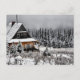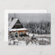 Scène de l'hiver, avec un cabine en bois recouvert de neige. Évoque Noël dans un paysage sauvage et accidenté.