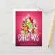 Carte postale de vacances avec illustration de Noël cool. Le texte dit Joyeux Noël & Bonne Année. Conçu avec un monticule de cadeaux en forme d'arbre avec des flocons de neige festifs, des étoiles, des baubles de noël et des étincelles à l'air brillant. L'arrière - plan est une couleur rose rougeâtre vibrante.