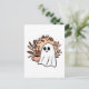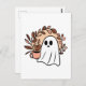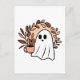 Carte postale fantôme et café. Jolies cartes de saison d'automne. Illustration beige, marron et rose avec un fantôme mignon tenant une tasse de café. Cartes esthétiques d'automne douillettes.