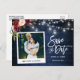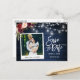 Script De Brosse Moderne, Style Caméra Instant, Couple Photo Enregistrer La Date Photo Fiançailles Carte Postale - Rustic Blue Country Wood, Mason Jar String Lights. Inclut Watercolor Burgundy Floral avec roses bordeaux, roses rouges, roses roses roses et verdure botanique.