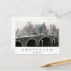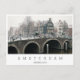 Photo carte postale d'un canal avec un pont, maisons traditionnelles et vélos sous un peu de neige en hiver dans la capitale hollandaise, Amsterdam, avec un bord blanc et le texte 'Amsterdam, Pays-Bas'.