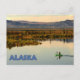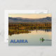 Seul dans le désert. Un canot surplombe l'eau glacée du lac à l'intérieur de l'Alaska. Au loin la taïga typique et les montagnes. Le texte "Alaska" apparaît également. Cette image provient d'une photographie du United States Fish and Wildlife Service.