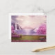 Une carte postale avec une image panoramique d'un lac violet paisible. Entouré de cerisiers luxuriants et de cascades.