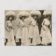 Photo vintage et ridicule de quatre filles debout dans la file portant de grands casquettes et tenant leurs pétticoats devant elles