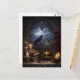 This cathedral gothic postcard features a raven perched atop an antique birdcage, illuminated by warm candlelight beneath a towering gothic arch and glowing full moon. Surrounded by vintage books, deep red roses, and dramatic shadows, this atmospheric still life captures the mystery and elegance of classic gothic architecture.