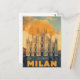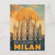 Cette carte élégante présente une illustration de style vintage de l'emblématique cathédrale de Milan (Duomo di Milano). Le design reflète la grandeur de l'architecture gothique, encadrée par un soleil doré audacieux et un ciel nuageux spectaculaire. La palette de couleurs rétro et la typographie chic "MILAN" lui donnent une sensation amusante et nostalgique d'affiche de voyage. Parfait pour un billet d'Italie ou pour toute personne qui aime voyager et l'art.