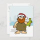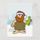 Un Caveman Père Noël souriant tenant un jouet de dinosaure.